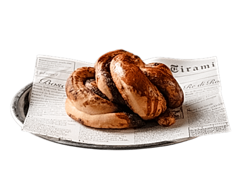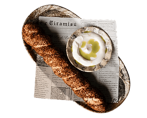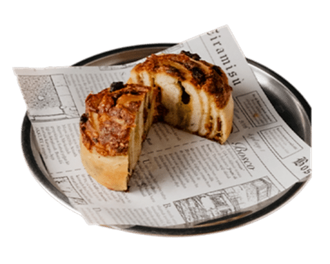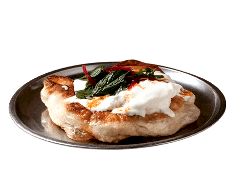 Biga mayalı 2 gün fermenteli bosco özel pişi üzeri 2 adet poche yumurta, yoğurtlu sos, baharatlı tereyağı ve taze yeşillik ile servis edilmektedir.