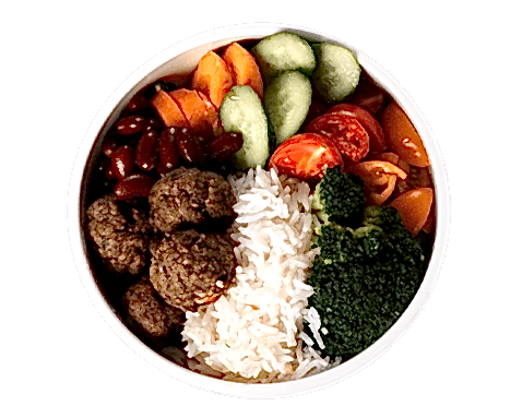 Zeytinyağı ile hazırlanmış basmati pilavı 160 gr, meksika fasulyesi, blanch edilmiş brokoli, havuç ve salatalık slice, maskolin, cherry domatesler.